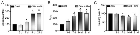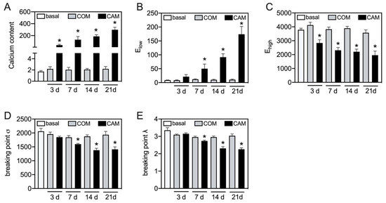 Therefore, the time-dependent effect of changes in the biomechanical properties should be elucidated. The aortic tissue was incubated ex vivo with COM or CAM for 0, 3, 7, 14, and 21 days. The chosen time points were in common with previous studies. While no significant effect on detected parameters was seen in COM-stimulated tissue, CAM stimulation leads to an induction of vascular calcification and corresponding changes in the stress–stretch curve (Figure 4). The calcium content increases over time and significantly starts to differ at 3 d of incubation (Figure 4A). In addition, a similar trend was seen for Elow, which time-dependently and significantly increases upon 7 d of incubation in CAM (Figure 4B). Ehigh decreases over time, while the effect becomes significant upon 3 d of incubation in CAM (Figure 4C). The breaking points (stress and stretch) significantly decrease upon 7 d of incubation in CAM (Figure 4D,E).