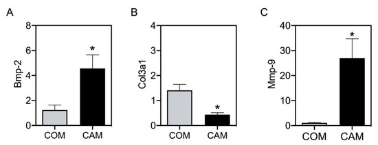 The values of Elow and Ehigh are predominantly representative of the elastin and collagen to stiffness, respectively [14]. Therefore, we next tested whether detected changes in Elow and Ehigh correspond to changes in aortic gene expression. Bmp-2 was measured as an osteogenic marker. As expected, and as is known from previous studies, Bmp-2 significantly increases in CAM-treated aortic tissue (Figure 5A). In addition, Col3a1 significantly decreases in CAM-treated aortic tissue compared to its respective COM-treated tissue (Figure 5B). Mmp-9, as one matrix metalloproteinase cleaving elastin, was significantly increased upon CAM stimulation (Figure 5C).
