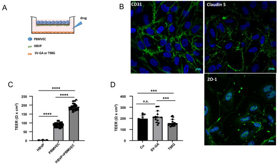The in vitro blood–brain barrier (BBB) model. (A) Scheme of porcine brain microvascular endothelial cells (PBMVEC), human brain microvascular pericytes (HBVP) and SV40 large T-antigene immortalized astrocytic cells (SV-GA) or T98G glioblastoma cell line localization in the BBB co-culture model co-culture. (B) CD31, claudin 5 and ZO-1 staining of isolated PBMVEC (bars = 10 µm). (C) The cells were cultivated as described in the material and methods part either as monocultures (HBVP on the bottom insert membrane; PBMVEC on the top insert membrane) or as co-cultures. After 5 days, the membrane integrity was determined by TEER measurement (n = 3, each up to 10 replicates, SEM, t-test, **** p < 0.0001). (D) Co-culture of barrier-tight BBB-layers (containing PBMVEC and HBVP) with SV-GA or T98G cells. TEER was performed 24 h after co-culture (Co: no additional cells were seeded; n > 7, SEM, t-test, *** p < 0.005). Co-culture with astrocytic cells strengthens, with glioma cells weakens barrier integrity. (C,D) Circles, squares and triangles at the appropriate bars indicate data points of single experiments.