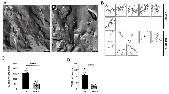 TGF-β treatment of HBVP reduced the amount and complexity of TJ in endothelial cells. (A) TGF-β1 plus -β2 (each 10 ng/mL) were added into the bottom chamber of wells containing intact BBB layers. Twenty-four hours later, PBMVEC growing on the upper part of the membrane were collected and prepared for freeze fraction electron microscopy. Red stars exemplarily indicate TJ branches. Exemplarily, one photograph is shown. (B) TJs were manually labeled in different visual fields (n = 2, in total 4 replicates). (C,D) Quantification of TJs density (C) and complexity (D). Black bar and circles present controls, grey bars and squares present the TGF-β treatment (n = 6 visual fields for controls, n = 8 for TGF-β; **** p < 0.0001).