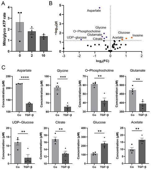Metabolomics analysis of HBVP upon TGF-β treatment. (A) Determination of mitochondrial to glycolytic ATP production at different TGF-β concentrations using respiratory analysis. HBVP were treated with TGF-β (2 or 10 ng/mL, dark grey bars; black triangles) for 16 h or were left untreated (0; light grey bar; black dots; n = 3, each 6 technical replicates, SEM). (B) Volcano plot visualizing most significant metabolite concentration increase (orange dots) and decrease (purple dots) upon TGF-β treatment compared to control for p < 0.05, false discovery rate (FDR)-corrected data with fold change (FC) threshold >1.2 (n = 4). (C) Bar plots with individual replicate points and SEM of the most significant metabolite changes upon TGF-β treatment (each 5 ng/mL of TGF-β1 plus β2; black triangles) (n = 4): aspartate, glycine, O-phosphocholine, glutamate, UDP-glucose, and citrate concentrations were decreased compared to control (black dots), while glucose and acetate concentrations increased upon TGF-β treatment, based on parametric, unpaired t-test, ** p < 0.01, *** p < 0.001, **** p < 0.0001. Grey bar and circles present controls, dark grey bars and squares present the TGF-β treatment.