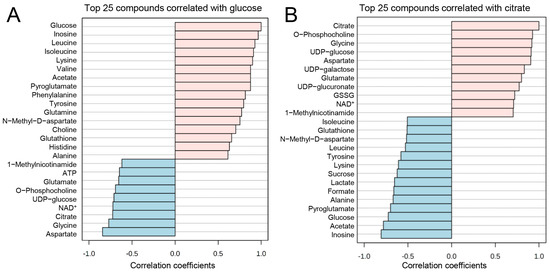 Pattern hunter analysis of glucose and citrate. (A) Glucose concentration pattern changes positively correlate (pink bars) with inosine, leucine, isoleucine, lysine, valine, acetate, pyroglutamate, phenylalanine, tyrosine, glutamine, N-methyl-D-aspartate, choline, glutathione, histidine, and alanine, while negatively correlate (blue bars) with aspartate, glycine, citrate, nicotinamide adenine dinucleotide (NAD)+, uridine diphosphate (UDP)-glucose, O-phosphocholine, glutamate, adenosine triphosphate (ATP) and 1-methylnicotinamide. (B) Citrate positively (pinks bars) correlates with O-phosphocholine, glycine, UDP-glucose, aspartate, UDP-galactose, UDP-glucuronate, oxidized glutathione (GSSG), NAD+, and 1-methylnicotinamide; and negatively (blue bars) correlates with inosine, acetate, glucose, pyroglutamate, alanine, formate, lactate, sucrose, lysine, tyrosine, leucine, N-methyl-D-aspartate, glutathione, and isoleucine concentration patterns, based on Pearson r distance measure (n = 4, two-group comparison).
