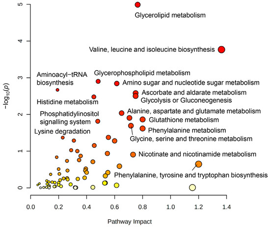Joint pathway analysis of 1H-NMR spectroscopy-based metabolomics and RNA-seq gene fold change data. Pathway analysis indicates the most significantly changed metabolic pathways (the node color scheme is based on p-values from yellow dots = low significance to red dots = high significance and the node radius is determined based on the pathway impact value). Glycerolipid metabolism, branched-chain amino acid (BCAA) metabolism of valine, leucine, and isoleucine biosynthesis, glycerophospholipid metabolism, amino sugar and nucleotide sugar metabolism, ascorbate metabolism, glycolysis or gluconeogenesis, and alanine, aspartate, and glutamate metabolism, were most affected based on Kyoto Encyclopedia of Genes and Genomes (KEGG) pathway database. For joint-pathway analysis, data from metabolomics (n = 4) and RNA-seq (n = 4) were used.