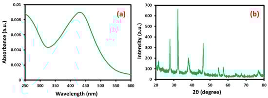 (a) UV–visible, and (b) XRD analysis of silver nanoparticles.