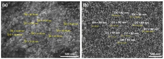 The size and morphology of the silver nanoparticle-loaded liposomes were analyzed using a field emission scanning electron microscope (FESEM). FESEM analysis revealed the presence of spherical shape AgNP-loaded liposomes which are in the size range of 80–97 nm (Figure 4). The size of the silver nanoparticle-loaded liposomes that are observed in SEM analysis is lesser than the size observed in DLS analysis. This is because the SEM measures the number-based size distribution and it will not measure the ions and molecules that are present on the surface of the particle. However, DLS is based on the measurement of hydrodynamic size which includes capping agent. Our results coincide with the study conducted by Yusuf et al., in which the silver nanoparticles were uniformly distributed, and spherical in shape with ~82 nm in size in the composite of encapsulated silver nanoparticles with liposomes [35].