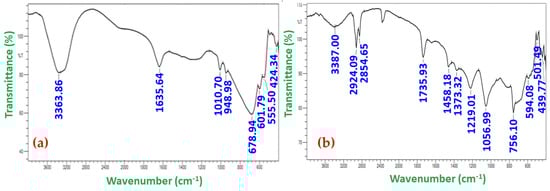 The FTIR spectral analysis was carried out to analyze the functional groups that play a role in the formation of silver nanoparticle-loaded liposomes. The FTIR spectrum was recorded for both the blank liposomes (lecithin and cholesterol alone- before the encapsulation of silver nanoparticles) and the silver nanoparticle-loaded liposomes (Figure 5a,b). The FTIR spectrum of the blank liposomes shows various peaks at different wave numbers including 555, 601, 678, 948, 1010, 1635, and 3363 cm−1. These peaks correspond to various functional groups which are as follows: a peak at 555 cm−1 represents C-Br stretching which indicates the presence of halo compounds, and another band at 601 cm−1 corresponds to the C-Cl which indicates alkyl halides. A peak at 678 cm−1 corresponds to =CH which indicates aromatic compounds [59]. A peak at 1010 cm−1 and 948 cm−1 represents C=C, respectively. FTIR spectrum at 1635 cm−1 and 3363 cm−1 corresponds to C=O and O-H bonds respectively [60].
