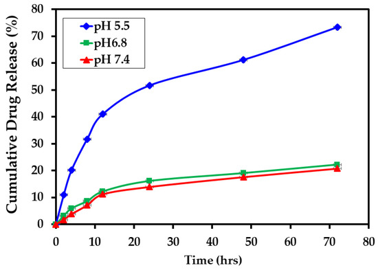 The in vitro release of silver nanoparticles from the liposomes were analyzed using three different pH; pH 7.4 which corresponds to the pH of blood, pH 6.8 which corresponds to the pH of cancer cells and pH 5.5 which corresponds to the mature Endosomes of cancer cells for different time intervals such as 2, 4, 8, 12, 24, 48, and 72 h. The in vitro drug release profile of silver nanoparticle-loaded liposomes are shown in Figure 6.