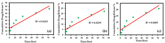 According to zero-order drug release kinetics, a drug release from a drug delivery system remains constant per unit of time and it is independent of concentration. To evaluate the drug release by zero-order kinetics, a graph was plotted between time and cumulative drug release % (Figure 7a–c). The slope of the graph provides a rate constant for the zero-order model. The correlation coefficient R2 can be used to predict whether the drug release follows a zero-order model or not [64].