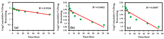 According to first-order drug release kinetics, the drug release rate is proportional to the drug concentration which indicates that when there is a high concentration of the drug, the release rate also will be high and when the drug concentration decreases, the drug release also decreases [64]. To study the first-order release kinetics for various pHs, a graph was plotted between the log % of drug remaining and time (Figure 8a–c). From the slope of the line, the first-order rate constant can be predicted and the correlation coefficient value indicates whether the drug release obeys first-order kinetics or not.