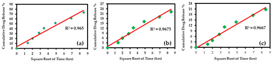 According to the Higuchi model, the drug release from a matrix as a square root of time is based on the process of diffusion. If there is the highest correlation coefficient, then it can be predicted that the drug release is through diffusion. There are some predictions for the Higuchi model and they include: the drug concentration is much higher than the solubility of the matrix at time t0, Sink conditions are maintained perfectly, and there is constant drug diffusion [46]. To study the Higuchi model of drug release kinetics for various pHs, a graph was plotted between cumulative % drug release and square root time (Figure 9a–c).