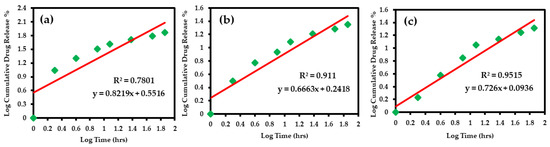From the Higuchi model of drug release kinetics, it is confirmed that the drug release is through diffusion. The Korsmeyer–Peppas model is fitted to understand that drug release follows type of diffusion [65]. To study the drug release kinetics by the Korsmeyer–Peppas model, a graph was plotted between log cumulative drug release % and log time (Figure 10a–c). From the n value (release exponent) obtained using the plot, the type of diffusion can be predicted.