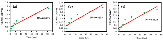 According to the Hixson–Crowell model, the drug release is by dissolution and not by diffusion. It is based on the fact that there is a change in the surface area and diameter of the particle when there is dissolution [65]. To study the drug release kinetics by Hixson–Crowell model, a graph was plotted between the cube root of the initial drug concentration and the concentration of the drug at time t against time (Figure 11a–c).