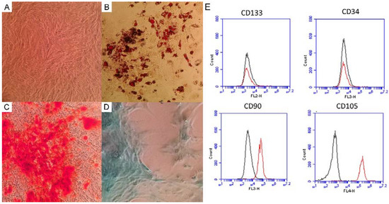 The immunophenotypic profile of AMSCs expressed the CD90 and CD105 markers and it did not express CD133 and CD34. So, this result corroborated the fact that these are mesenchymal stromal cells (Figure 1E). The differentiation was confirmed by the presence of lipid droplets and an extracellular matrix rich in calcium and glycosaminoglics after staining with Oil Red, Alizarida Red and Alcian Blue, respectively (Figure 1A–D), the second protocol of SCHWEICH [5].