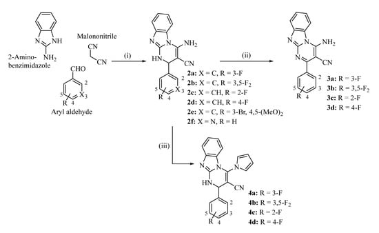 The 4-amino-3-cyano-2-aryl-1,2-dihydropyrimido[1,2-a]benzimidazoles 2a–f were obtained from the three-component reaction of 2-aminobenzimidazole, malononitrile, and the corresponding aryl aldehyde under “green” conditions in hot H2O (Scheme 1). Compounds 2c and 2d were published before and were added to this compound series for comparison purposes in the following antiparasitic tests [,]. The fluorophenyl-substituted derivatives 2a–d were used as starting materials for the synthesis of compounds 3a–d and 4a–d. Oxidation of 2a–d with p-chloranil generated the pyrimido[1,2-a]benzimidazoles 3a–d. Compounds 3a–c are new, while 3d was published before []. The reaction of 2a–d with 2,5-dimethoxytetrahydrofuran led to the new pyrroles 4a–d, which were prepared in order to evaluate the role of the 4-amino group of compounds 2a–d.