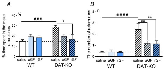 - Kurzina, N.P.; Aristova, I.Y.; Volnova, A.B.; Gainetdinov, R.R. Deficit in Working Memory and Abnormal Behavioral Tactics in Dopamine Transporter Knockout Rats during Training in the 8-Arm Maze. Behav. Brain Res. 2020, 390, 112642. [Google Scholar] [CrossRef] [PubMed]