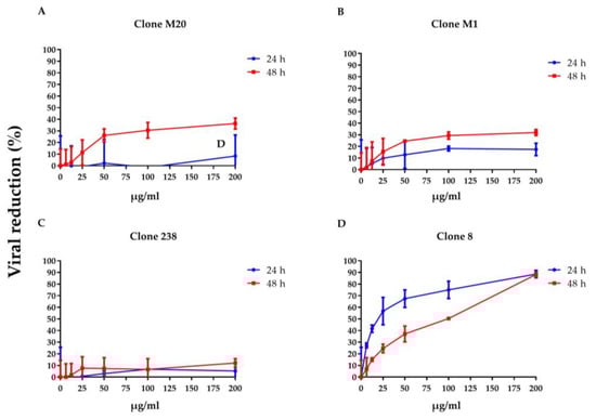 Anti-DENV NS1 HuMAbs induce ZIKV neutralization in endothelial cells: HUVECs are infected with ZIKV (MOI = 0.125) at 24 and 48 h post-infection. To determine the neutralization potency represented by the percentage of viral reduction in Vero cells, culture supernatants from four HuMAbs against DENV NS1 (A) M20; (B) M1; (C) 238 and (D) 8-treated infected cells are collected. The results are presented as the mean ± SD of duplicate independent experiments.