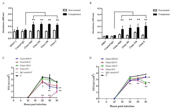Anti-DENV NS1 HuMAbs stimulate complement-mediated cell cytolysis and inhibition of viral replication: HMEC-1 and HUVECs are infected with (A) DENV serotype 2 and (B) ZIKV (MOI = 5.0), respectively. At 36 h post-infection, cells are incubated with four anti-DENV NS1 HuMAbs (clones M20, M1, 238, and 8) (100 µg/mL) or control IgG for 30 min at 37 °C with complement (C’) for 4 h at 37 °C. The culture supernatants from all groups under each condition are determined for cell cytolysis by detecting the release of lactate dehydrogenase (LDH) (** p-value < 0.01). At 6 h post-infection, (C) DENV-infected HMEC-1 or (D) ZIKV-infected HUVECs are incubated with four anti-DENV NS1 HuMAbs (M20, M1, 238, and 8) (100 µg/mL) or control IgG at different timepoints with complement addition. Viral titers in supernatants are measured using focus forming assay as FFU/mL. The results presented as the mean ± SD of duplicate independent experiments in different time points (* p-value < 0.05; ** p-value < 0.01 compared with C’ plus control IgG).