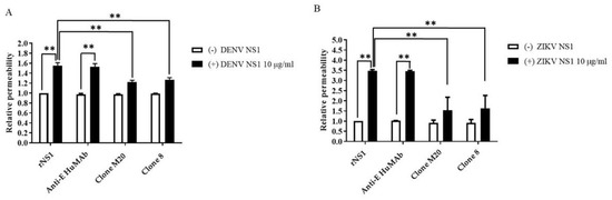 DENV NS1 HuMAbs protect NS1-mediated endothelial leakage in vitro: monolayer of HMEC-1 and HUVECs cells are grown on Transwell inserts and incubated with (A) DENV NS1 or (B) ZIKV NS1 alone or NS1 with either anti-E HuMAb or anti-DENV NS1 HuMAbs; M20 and 8. Untreated cells are used as a negative control. After 24 h treatment, endothelial permeability has been evaluated by measuring the HRP activity. The results are presented as the average of mean ± SD of two independent experiments. ** p-value < 0.01 indicates a significant difference.