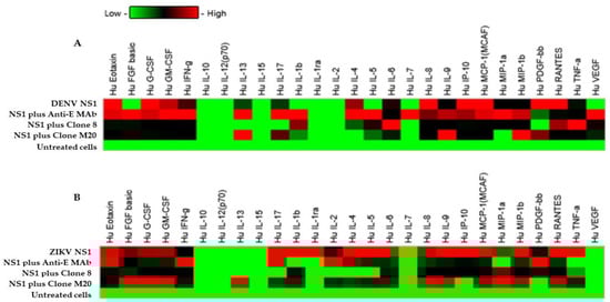 Effect of DENV NS1 HuMAbs to NS1-mediated inflammatory cytokines secretion in vitro: HMEC-1 and HUVECs cells were grown on Transwell inserts and incubated with (A) DENV NS1 and (B) ZIKV NS1 alone or NS1 with either anti-E HuMAb or anti-DENV NS1 HuMAbs; M20 and 8. Untreated cells are used as a negative control. The heatmap of cytokine production of DENV NS1-treated HMEC-1 cells and ZIKV NS1-treated HUVECs cells are analyzed, and the level of cytokine series is measured using human cytokine multiplex assay at 24 h post-treatment. Data are derived from two independent experiments, each with duplicate samples.