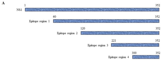 NS1, an immature monomeric nonstructural protein in the endoplasmic reticulum, is processed into a stable homodimeric form that can be covalently linked to the surface membrane through glycosylphosphatidylinositol [7]. Moreover, NS1 is a highly conserved protein among flaviviruses with 20–40% identity and 60–80% similarity, consisting of 352 amino acids with a molecular weight of 46–55 kDa depending on its glycosylation status [8,9]. NS1 is a multifunctional protein: intracellular NS1 is important for viral replication and assembly, whereas secreted NS1 leaves infected cells, circulates in the host’s bloodstream [8], and is associated with immune evasion [10,11].