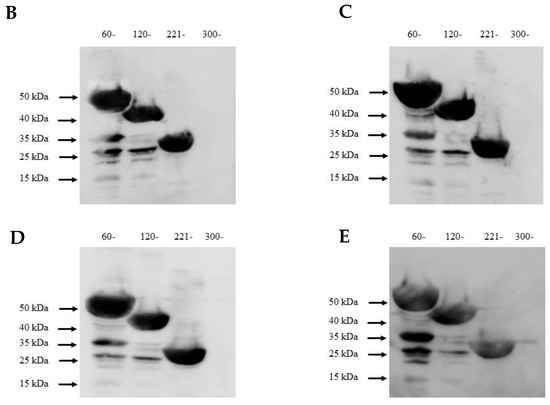 Epitope mapping of anti-DENV NS1 HuMAbs: (A) The truncated NS1 protein regions are constructed and expressed in E. Coli BL21DE3. Lysates expressing truncated NS1 proteins are loaded to SDS-PAGE, and the proteins were transferred to the PVDF membrane. Each epitope regions is subsequently stained with DENV NS1 HuMAbs (B) HuMAb M20; (C) HuMAb M1; (D) HuMAb 238, and (E) HuMAb 8.