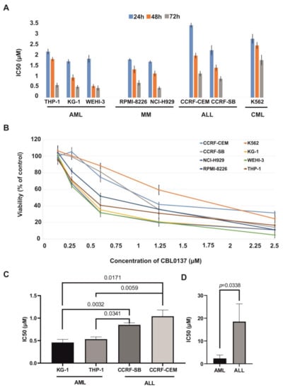 (A) IC50 after the cell treatment with CBL0137 over 24, 48 and 72 h; (B) cytotoxic effect of CBL0137 on hematological malignancy cells in vitro after 72 h treatment; (C) differences in the cytotoxic action CBL0137 among human cell lines of ALL and AML; (D) differences in the cytotoxic effects of CBL0137 on primary human ALL and AML cultures.