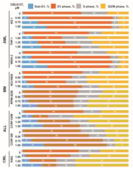 Cell cycle analysis by flow cytofluorometry with propidium iodide (PI) was performed using CBL0137 concentrations that were less than 24 h IC30, as well as its ¾ and ½ dilutions. Accordingly, CBL0137 concentrations of 1.00, 0.75 and 0.5 μM were used to treat CCRF-SB, KG-1, WEHI-3, RPMI-8226 and NCI-H929 cells, and 1.50, 1.25 and 1.00 μM were used to treat CCRF-CEM, K562 and THP-1 (Figure S2). In the analysis of CBL0137 effects on cell cycle phase distribution, an increase in the sub-G1 cell population was observed in all the hematological malignancies cell lines. Simultaneously, a significant increase in the G1 phase cell population was observed in KG-1 and WEHI-3 AML cells, as well as CCRF-SB ALL cells, but it was not dose-dependent. We also revealed the cell cycle arrest of THP-1 AML cells, RPMI-8226, NCI-H929G2 MM cells, CCRF-CEM ALL cells and K562 CML cells in G2/M phase, caused by CBL0137 treatment (Figure 2 and Figure S2).