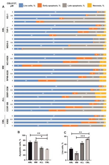 Effect of CBL0137 on the cell cycle in vitro after treatment within 24 h: (A) distribution of cell populations by fraction of living cells in necrosis and apoptosis (%); (B) proportions of populations of cells in apoptosis after treatment with 3 µM CBL0137; (C) proportion of living cells in the population after treatment with 3 µM CBL0137. * p ≤ 0.05, ** p ≤ 0.01, *** p ≤ 0.001.