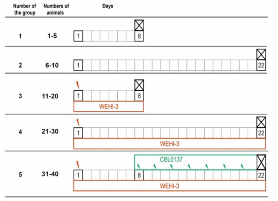Experimental schedule for testing anticancer effect of CBL0137 on WEHI-3 in vivo. Mice were randomized into five groups: two groups of 5 animals (group 1 and group 2) and three groups of 10 mice each (groups 3–5) were inoculated intraperitoneally by WEHI-3 cells (brown arrows). Eight days after inoculation of WEHI-3 cells, 10 mice of group 5 were injected intravenously 50 mg/kg CBL0137 every two days (green arrows). Animals from groups 1 and 3 groups were euthanized on the 8th day and all other groups on the 22nd day.
