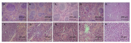 Microphotographs of spleen tissue with varying degrees of damage: (A,F)—0 (mice # 2); (B,G)—1 (mice # 15); (C,H)—2 (mice # 33); (D,I)—3 (mice # 27); (E,K)—4(mice # 29); (A–E)—x40, (F–K)—x400.