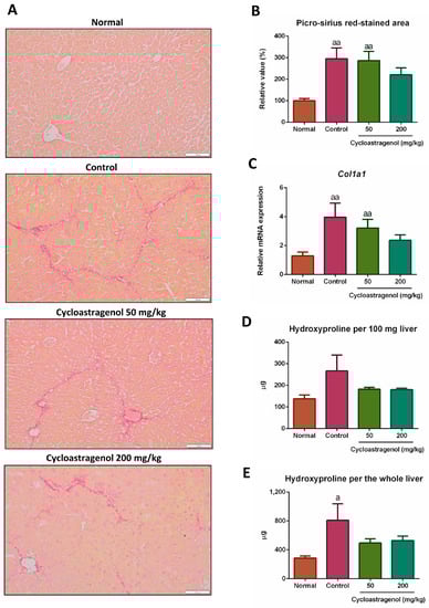 Anti-fibrotic efficacy of cycloastragenol (50 mg/kg and 200 mg/kg) in the liver of mice treated with carbon-tetrachloride. Representative picro-sirius red-stained pictures of the liver among each group (A) are shown. The stained areas of picro-sirius red (B) and relative mRNA expression of collagen type 1 (Col1a1, (C)) when compared with the normal are shown. Hydroxyproline contents of the liver when calculated per 100 mg liver tissue (D) and per the whole liver (E) are shown. Scaled bar = 100 μm. Bar graphs and corresponding error bars indicate means and SEM among the same treatment, respectively (n = 8–10). a and aa indicate p < 0.05 and 0.01 when compared with the normal, respectively.