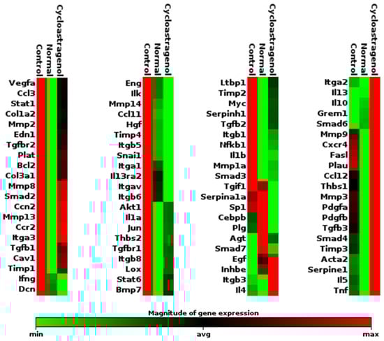 Effects of cycloastragenol (200 mg/kg) on the expression 84 fibrosis-related genes in the liver of mice treated with carbon-tetrachloride. Relative mRNA expression of each gene when compared with the normal are indicated using arrays of colors in a heat-map clustogram, representing a sample among each group, is shown.