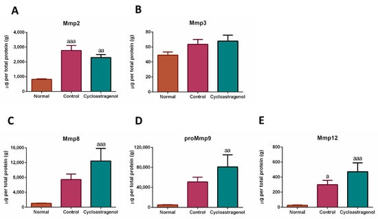 Effects of cycloastragenol (200 mg/kg) on the level of matrix-metalloproteinases (Mmps) in the liver of mice treated with carbon-tetrachloride. Data are expressed as the levels of Mmp2 (A), Mmp3 (B), Mmp8 (C), proMmp9 (D), and Mmp12 (E), per total protein content of the liver (g). Bar graphs and corresponding error bars indicate means and SEM among the same treatment, respectively (n = 8–10). a, aa, and aaa indicate p < 0.05, 0.01, and 0.001 when compared with the normal, respectively.