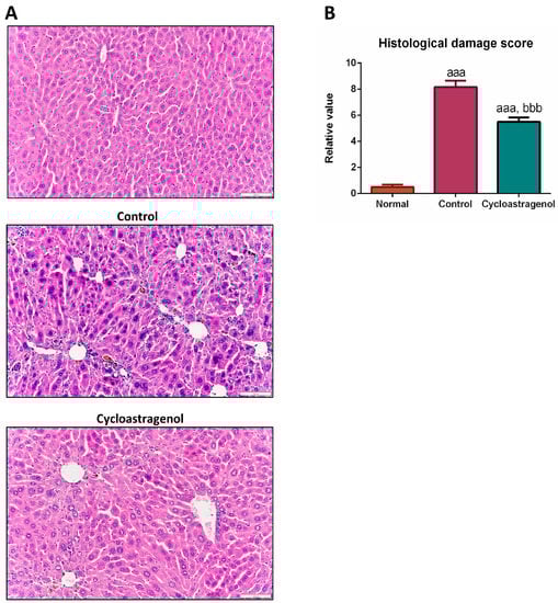 Hepatoprotective efficacy of cycloastragenol on histological damages in the liver of mice treated with carbon-tetrachloride. Representative hematoxylin/eosin-stained pictures of the liver among each group (A). The degree of hepatocyte degenerations, necrobiotic changes, and infiltrated lymphocytes were semi-quantified as histological damage scores. Data are shown when compared with the normal (B). Scaled bar = 100 μm. Bar graphs and corresponding error bars indicate means and SEM among the same treatment, respectively (n = 8–10). aaa and bbb indicate p < 0.001 when compared with the normal and control, respectively.