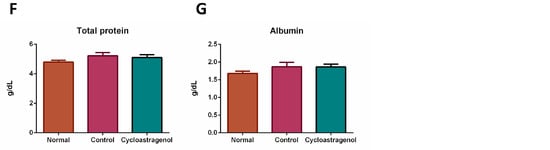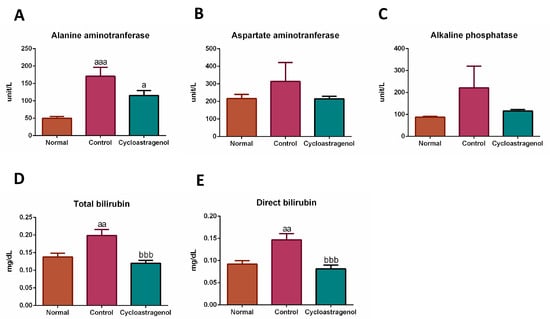 In line with the histological analysis, CCl4 evidently induced liver damages resulting in an increment in liver enzymes, especially alanine aminotransferase, in the serum. Moreover, the mice treated with CCl4 appeared to incite an impairment of liver function as seen by the increment of bilirubin, a waste biological product to be excreted by the liver (Figure 5). Cycloastragenol tended to mitigate the increment of serum liver enzymes, alanine aminotransferase, aspartate aminotransferase, alkaline phosphatase, and bilirubin, both measured as total (conjugated and unconjugated) and direct (conjugated). Thus, cycloastragenol elicited hepatoprotective efficacy and preserved liver function against CCl4.