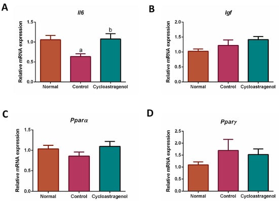 Effects of cycloastragenol (200 mg/kg) on the expression of gene-encoding markers associated with inflammation in the liver of mice treated with carbon-tetrachloride. Relative mRNA expression of interleukin 6 (Il6, (A)), insulin-like growth factor (Igf, (B)), peroxisome proliferator-activated receptor alpha (Pparα, (C)), and peroxisome proliferator-activated receptor gamma (Pparγ, (D)) when compared with the normal is shown. Bar graphs and corresponding error bars indicate means and SEM among the same treatment, respectively (n = 8–10). a and b indicate p < 0.05 when compared with the normal and control, respectively.