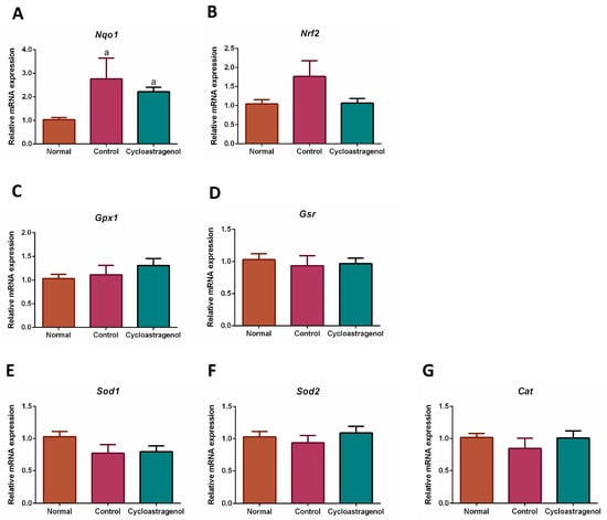 Effects of cycloastragenol (200 mg/kg) on the expression of gene-encoding markers associated with oxidative stress in the liver of mice treated with carbon-tetrachloride. Relative mRNA expression of NAD(P)H quinone dehydrogenase 1 (Nqo1, (A)), nuclear factor erythroid 2-related factor 2 (Nrf2, (B)), glutathione peroxidase 1 (Gpx1, (C)), glutathione-disulfide reductase (Gsr, (D)), superoxide dismutase 1 (Sod1, (E)), superoxide dismutase 2 (Sod2, (F)), and catalase (Cat, (G)) when compared with the normal is shown. Bar graphs and corresponding error bars indicate means and SEM among the same treatment, respectively (n = 8–10). a indicates p < 0.05 when compared with the normal.