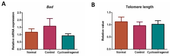 The gene expression of a senescent marker Bcl2-associated agonist of cell death (Bad) was not obviously increased in response to CCl4 (Figure 8). Thus, although the level was comparable to the normal, we could not conclude that cycloastragenol exhibited anti-senescent efficacy. This finding was in line with the length of telomere in the genomic DNA of mice treated with CCl4 and cycloastragenol.