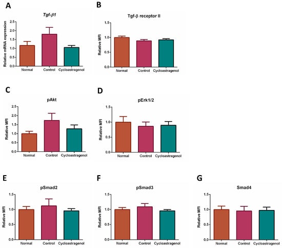 Effects of cycloastragenol (200 mg/kg) on the expression of markers associated with transforming growth factor-beta 1 (TGF-β1) signaling in the liver of mice treated with carbon-tetrachloride. Relative mRNA expression of TGF-β1 (Tgf-β1, (A)) and relative median fluorescence intensity (MFI) of transforming growth factor-beta receptor II (Tgf-β receptor II, (B)), phosphorylated protein kinase B (pAkt, (C)), phosphorylated extracellular signal-regulated kinase 1/2 (Erk1/2, (D)), phosphorylated-Smad2 (pSmad2, (E)), phosphorylated-Smad3 (pSmad3, (F)), and Smad4 (G) when compared with the normal are shown. Bar graphs and corresponding error bars indicate means and SEM among the same treatment, respectively (n = 8–10).