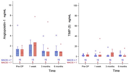 Serial change of urinary exosomal angiopoietin-1 and TIMP (5) in MACIS before and after operation.