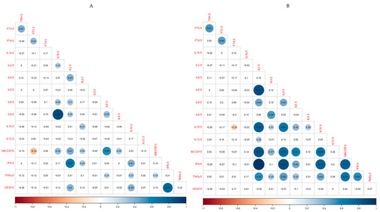 Heat map showing the associations of the thyroid hormones and cytokines evaluated at ICU admission (A) and day 5 (B). Pearson correlation coefficients are displayed. Circles representing the strength of correlation are omitted if they do not achieve statistical significance. Blue and red circles represent positive and negative correlations.