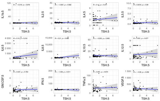 Scatter dots of correlations between TSH and cytokines at day 5.