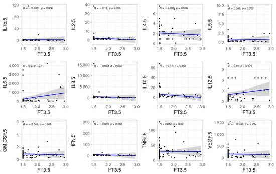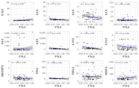 Scatter dots of correlations between fT4 and cytokines at day 5.
