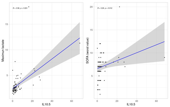 Scatter dots of correlations between IL-10 at day 5 and SOFA score values and maximum lactate.