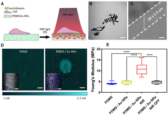 Like the abovementioned studies, our approach comprises the use of Au NRs as photothermal transducers. However, the substrate consists of a collagen-coated polydimethylsiloxane (PDMS) flat film. Numerous publications report using PDMS as a cell substrate to study cellular mechanoresponse mainly because it is a transparent, biocompatible, flexible, and easy to manipulate and pattern elastomer whose mechanical properties are easily tuneable [22,23]. PDMS is also an ideal candidate for actuator applications as PDMS responds to temperature changes [24,25,26].
