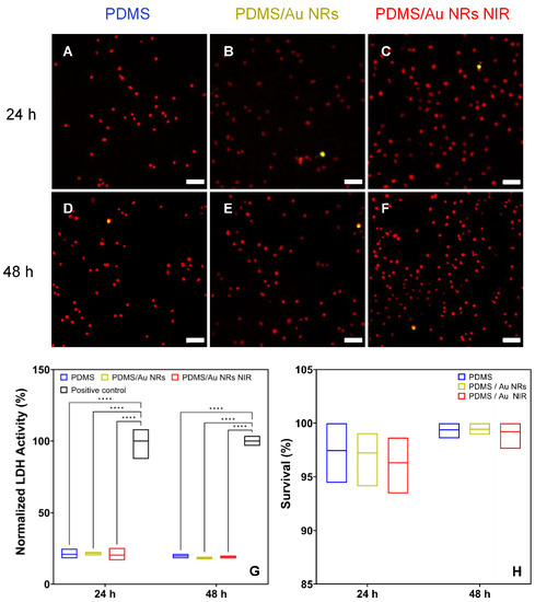 The ratio of live/dead stained cells obtained after performing a commercial LIVE/DEAD assay at 24 and 48 h shows little to no cytotoxic effects (Figure 2). Similarly, the lactate dehydrogenase (LDH) assay confirmed no cytotoxicity when cells were cultured on the control films (PDMS/Au NRs) and PDMS/Au NRs NIR for 24 and 48 h.