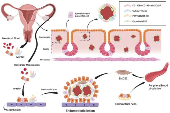 Stem cells are predominantly located in the basal layer of the endometrium. CD140b + CD146 + eMSC and SUSD2+ eMSC are located perivascularly and side population (SP) cells are located in the vascular endothelium, in both the basalis and functionalis layers of the endometrium. According to the retrograde menstruation theory, menstrual blood, containing MenSC and epithelial stem cells, flows toward the fallopian tubes and enters the pelvic cavity, invading the mesothelium and generating endometriotic implants. Endometriotic cells secrete cytokines that recruit bone marrow derived-stem cells (BMDSC) and incorporate them into the lesions. Endometriotic cells also enter the bloodstream causing distant implants [15].