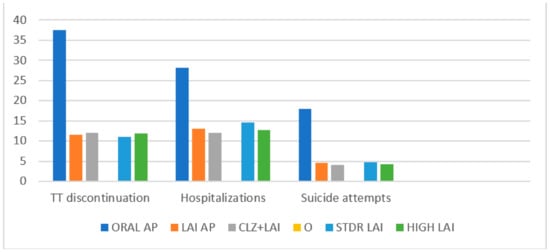 Psychiatric hospital admissions (considered to be relapses) were markedly lower in our study for patients on LAIs, taking into account that the study enrolled people with an increased risk of nonadherence and relapse [12,23,40]. It should also be noted that there were fewer involuntary admissions of patients on LAIs.