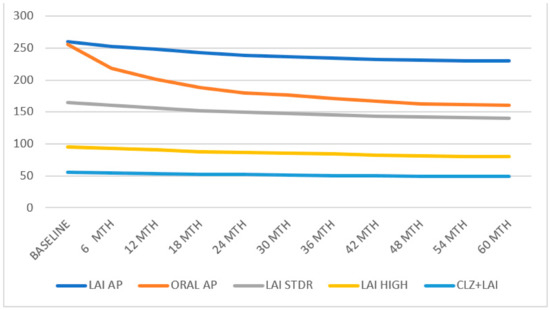 Recent studies comparing oral SGAs (oral APs) against LAIs in severely ill patients are relatively scarce and have the disadvantage of a brief follow-up period and a relatively small sample size [11,12,49,50,51,52]. The few observational studies that have used administrative databases and included a comparison group have also shown the advantages of LAI APs over oral APs [38,42]. Studies that compare periods of treatment with LAI APs versus oral APs for the same patients may better reflect their impact in the real world [12,18,33,53]. Cohort studies recorded mixed results, but most of them have better results for LAI APs than they do for oral APs [54,55,56].