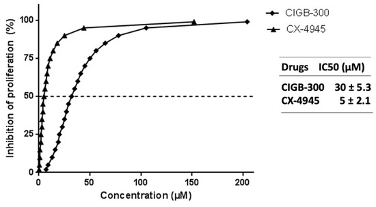 As a result, CIGB-300 and CX-4945 strongly inhibited the proliferation of NCI-H460, where a dose-response pattern was noticeable, reaching IC50 values of IC50 = 30 ± 5.3 µM and IC50 = 5 ± 2.1 µM, respectively (Figure 1). Of note, these LCLC cells are the cell line most sensitive toward the antiproliferative effect of CIGB-300, compared to other solid tumor cells whose IC50 mean value is about 60–300 µM [19].
